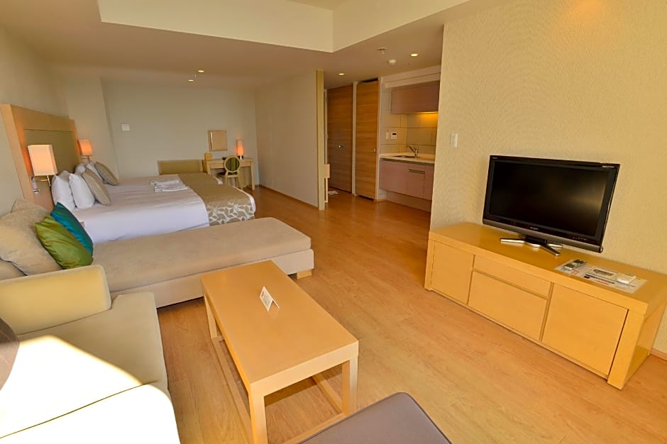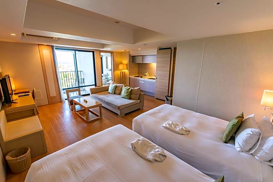 Spacious room with a balcony, and ocean or garden views. Featuring a wooden floor and a contemporary interior in light colors, it has a comfortable living space, twin beds and a kitchen. Free internet is provided.